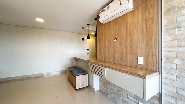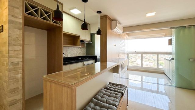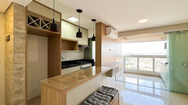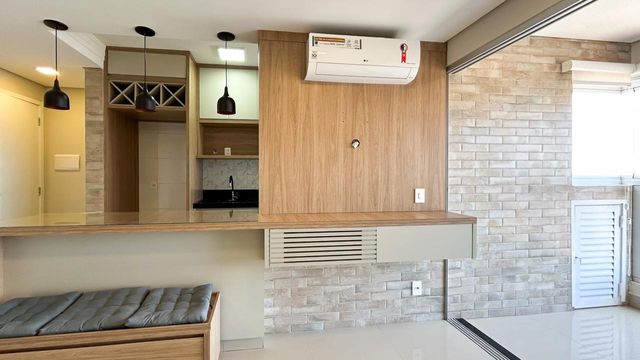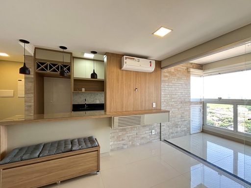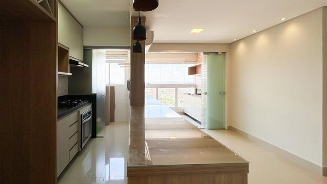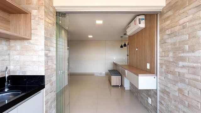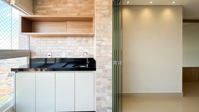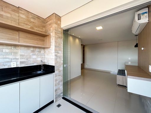 Ambientes integrados com sacada gourmet ampla e arejada