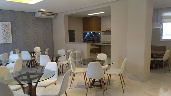 Salão de festas com churrasqueira e área gourmet