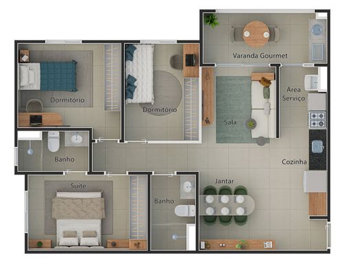 83m² (3 Quartos, sendo 1 Suíte)