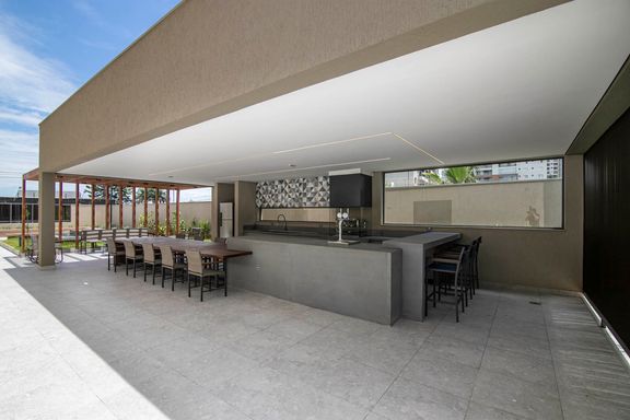 Um magnífico living incorpora área gourmet, apresentando um verdadeiro conceito aberto, que maximiza luz e espaço, aprimorado por portas de vidro de grandes dimensões, proporcionando uma vista memorável.