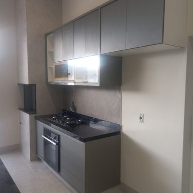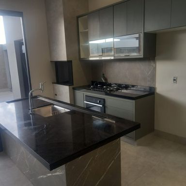 em 3 quartos, sendo 1 suíte, escritório, living com pé direito alto, área gourmet integrada com área da piscina, cozinha interna com cooktop, e um lindo jardim externo.