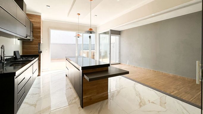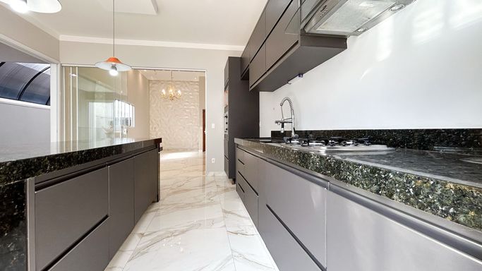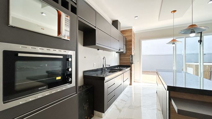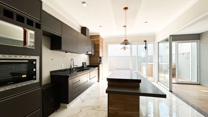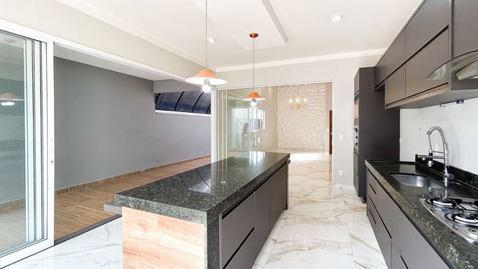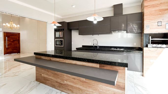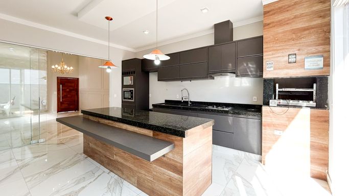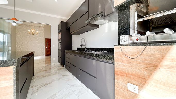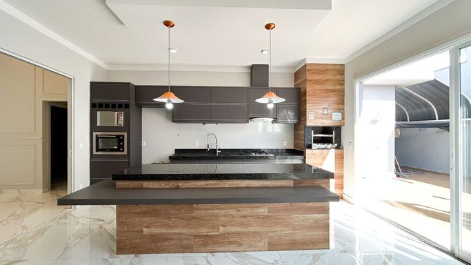 Espaço gourmet completo, com churrasqueira, balcão em pedra nobre e integração com a área externa