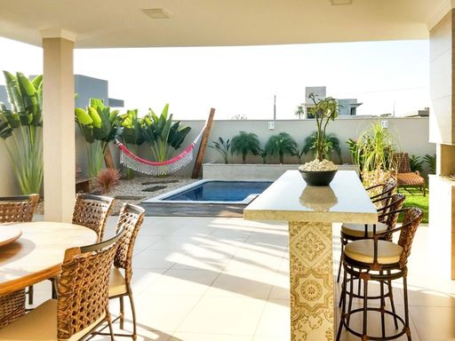 Casa térrea à venda, com 220 m² de construção, distribuídos em 3 quartos suítes, escritório, home, sala ampla com pé direito duplo e uma varanda gourmet aconchegante, bem equipada e integrada com espaçoso quintal, área verde e piscina.