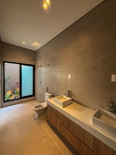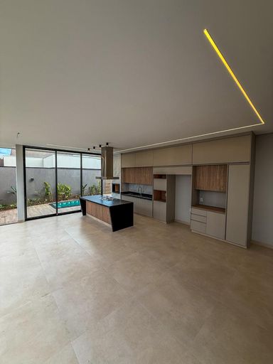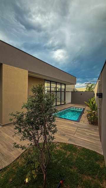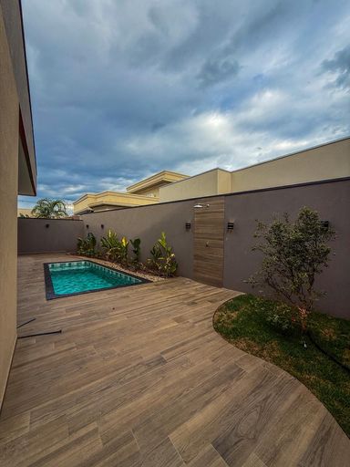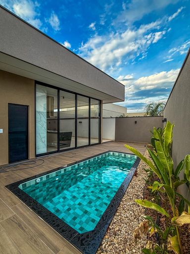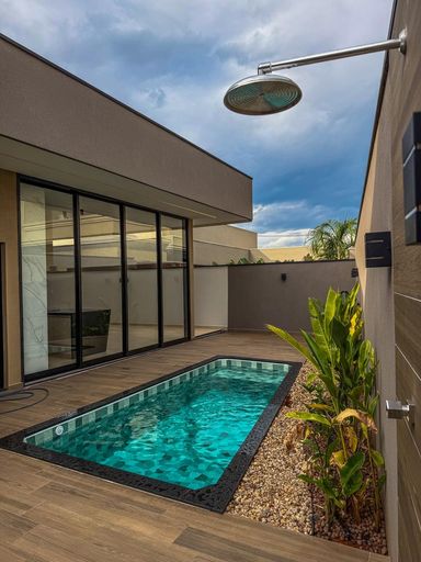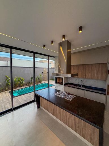 Casa térrea à venda, com 410 m², distribuídos em 3 quartos suítes, home, sala ampla com pé direito duplo e uma área gourmet aconchegante, bem equipada e integrada com espaçoso quintal, área verde e piscina.