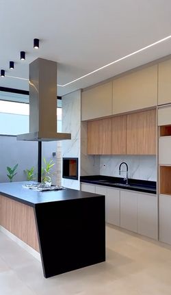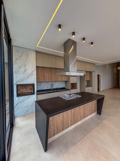 Cozinha com área gourmet, churrasqueira e balcão