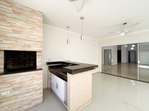 Varanda gourmet, com churrasqueira e integração com a área externa