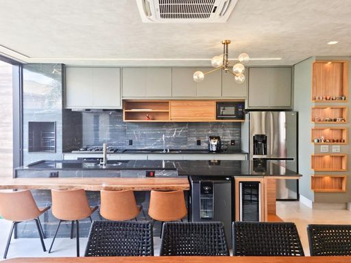 Cozinha gourmet equipada, com churrasqueira, coifa, cooktop e rica em armários