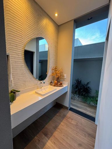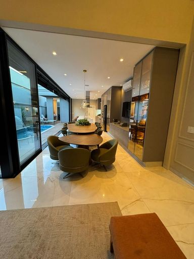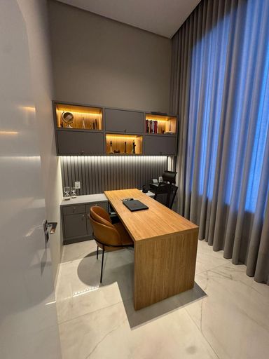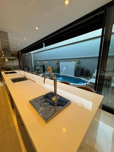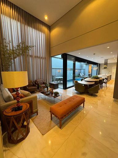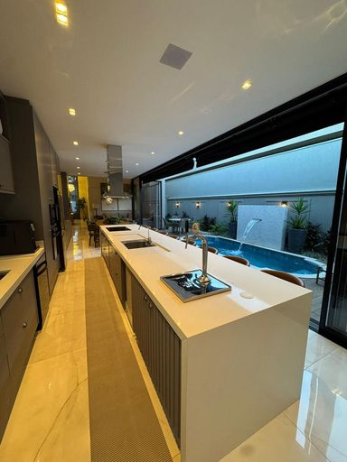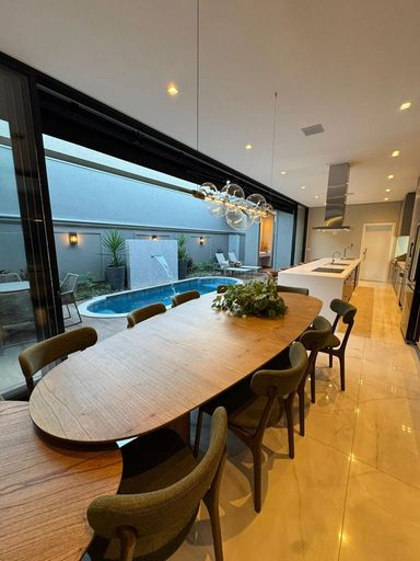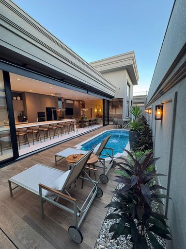 Casa térrea à venda, com 262 m² de construção, distribuídos em 3 quartos suítes, escritório, sala ampla com pé direito duplo e uma área gourmet aconchegante, bem equipada e integrada com o espaço da piscina.