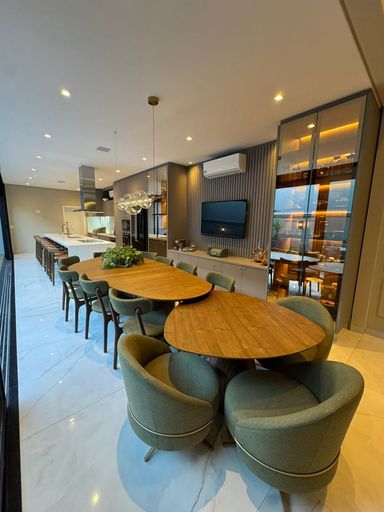 Cozinha gourmet com: churrasqueira a gás e churrasqueira a carvão chopeira / cervejeira / máquina de lavar louça / micro-ondas / forno elétrico / cooktop de indução / coifa / caixas de som JBL embutida no teto, toda mobiliada com banquetas e mesa de 8 cadeiras.