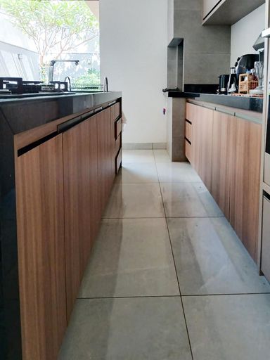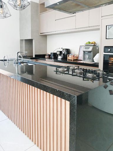 Cozinha com área gourmet, churrasqueira e balcão