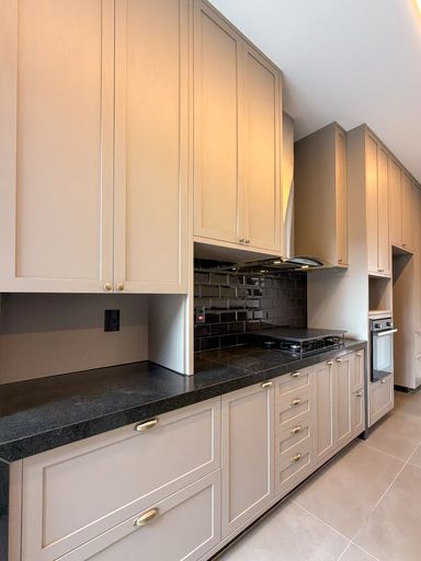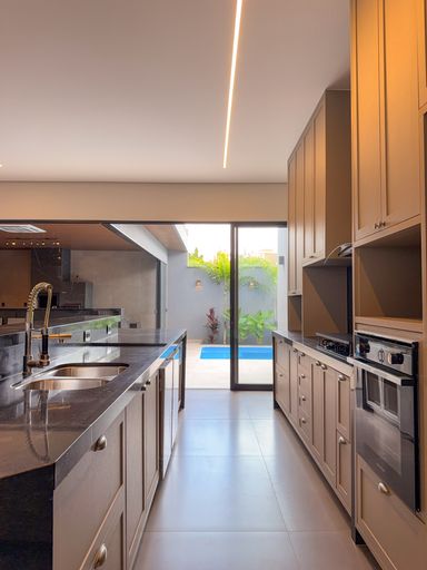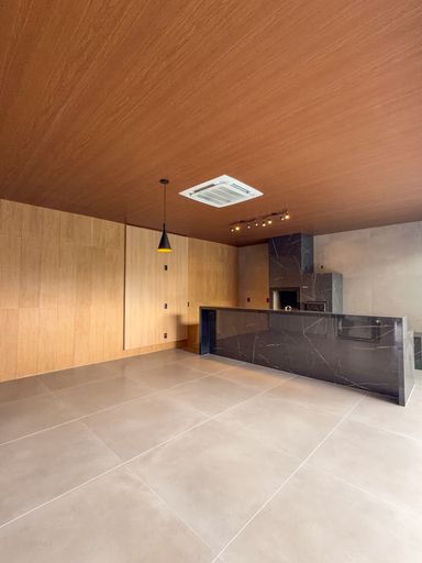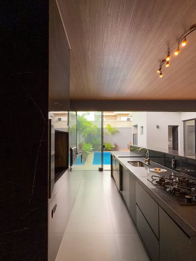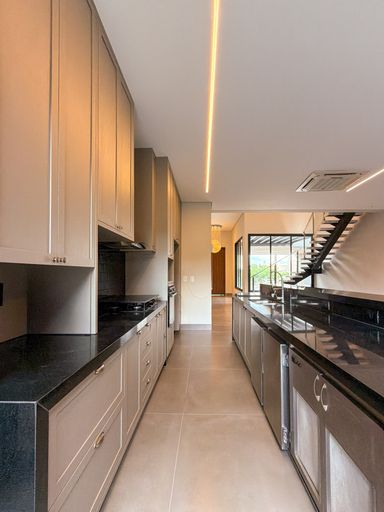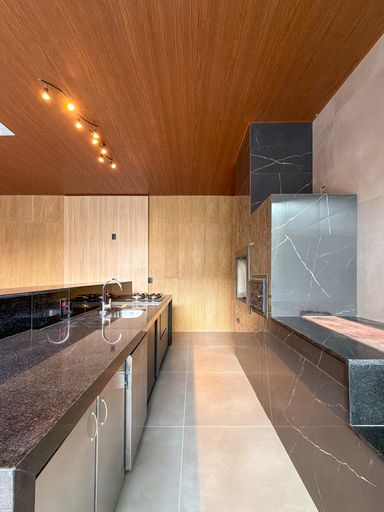 Cozinha com área gourmet, churrasqueira e balcão