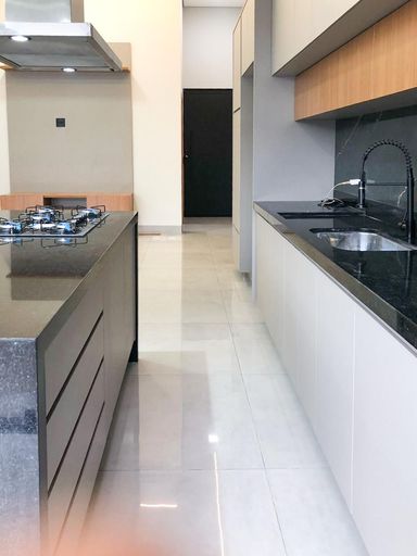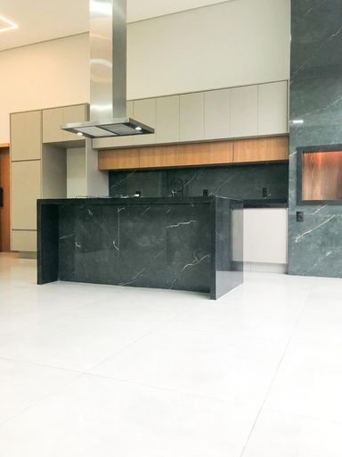 Cozinha com área gourmet com armário e coifa churrasqueira e balcão