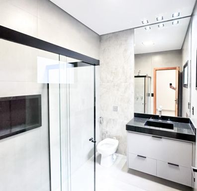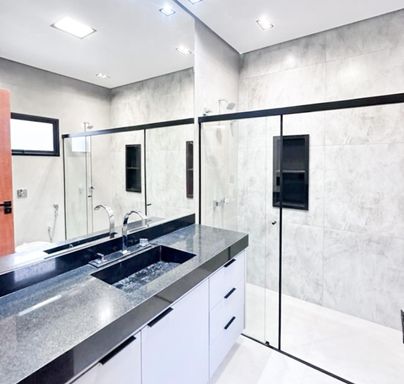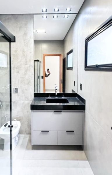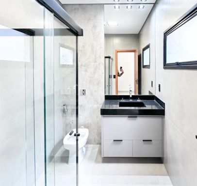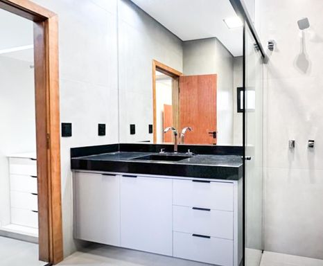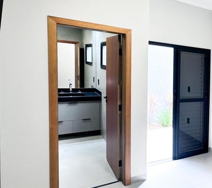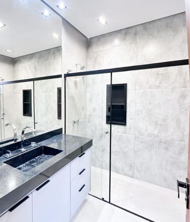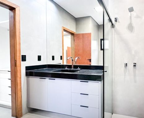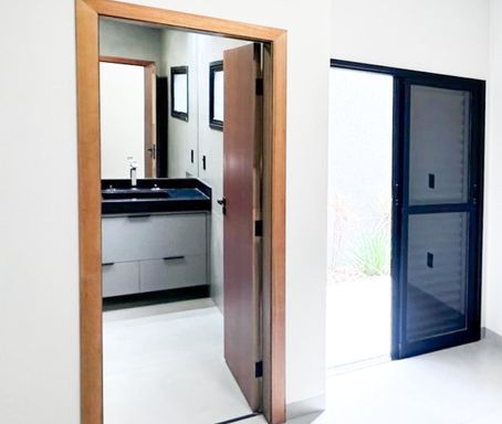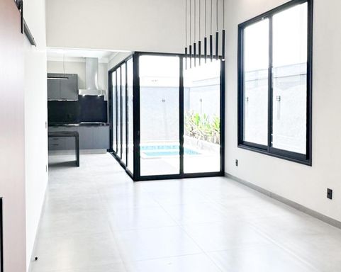Casa térrea à venda, com 157 m², distribuídos em 3 quartos suítes, escritório, home, sala ampla com pé direito alto e uma área gourmet aconchegante, bem equipada e integrada com espaçoso quintal, área verde e piscina.