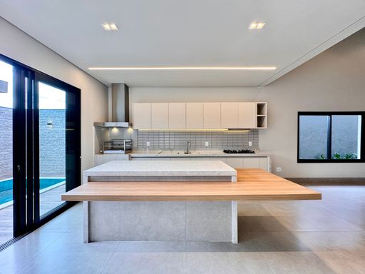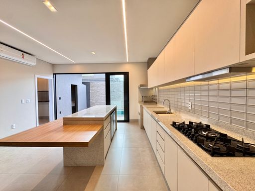 Cozinha com área gourmet, churrasqueira e balcão