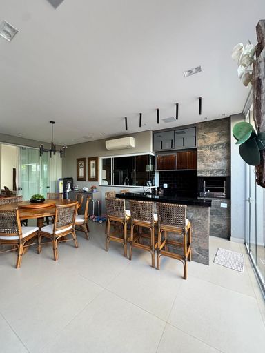 Cozinha com área gourmet, churrasqueira e balcão