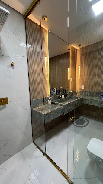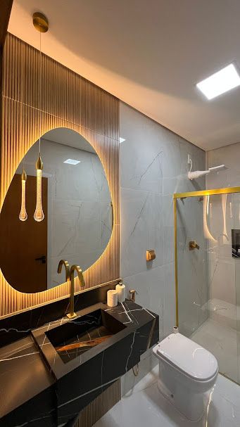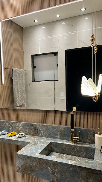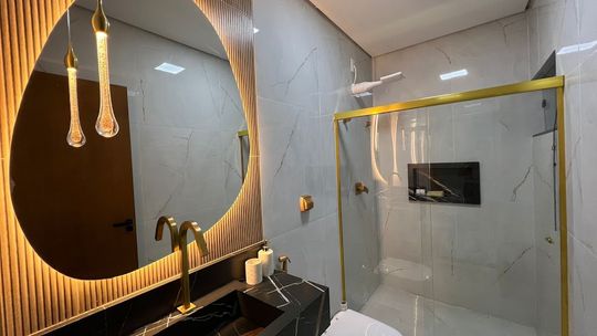 Imóvel rico em iluminação, criataleira e acessórios (torneiras, esquadrias dos banheiros, pendentes) todos em dourado dando elegância e sofisticação aos ambientes.