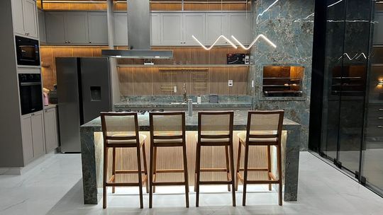 A cozinha gourmet é toda planejada e ampla, com churrasqueira e uma ilha com todo seu charme.