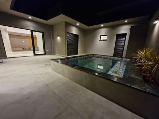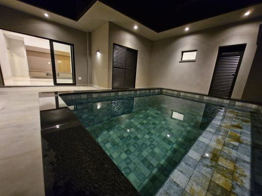 Piscina com iluminação RGB em led, cascata embutida e aquecimento de passagem com controlador de temperatura.