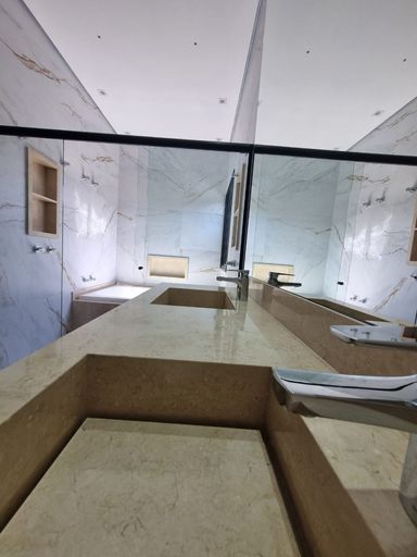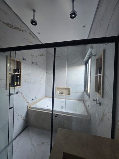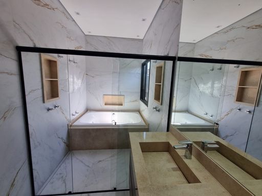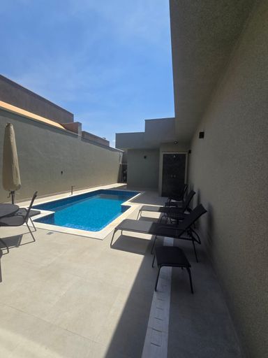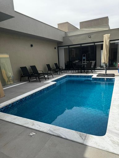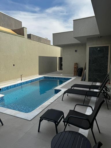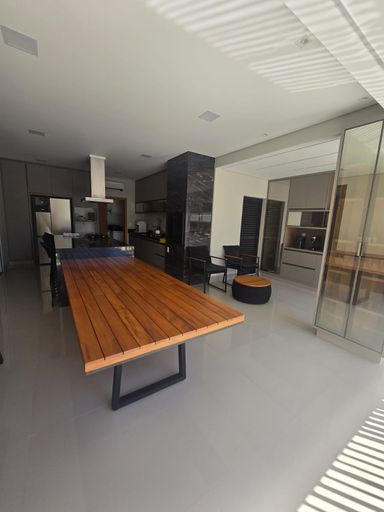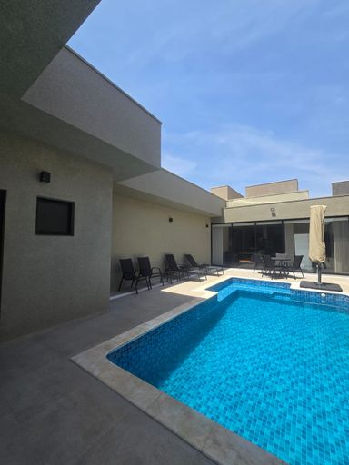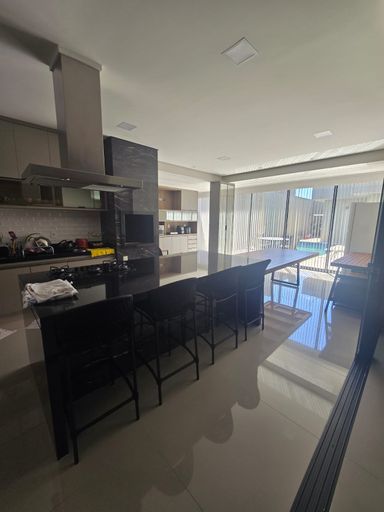 Casa térrea à venda, com 310m², distribuídos em 4 quartos suítes, (2 master com closet e banheira), escritório, sala, lavanderia dupla, riquíssima em móveis planejados em todos os ambientes, lavabo, e uma área gourmet aconchegante, bem equipada e integrada com espaçoso quintal e área da piscina.