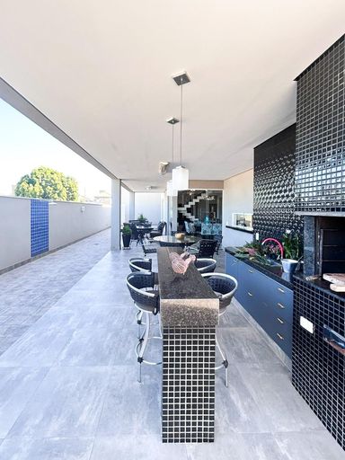 Varanda gourmet com churrasqueira e cozinha de apoio