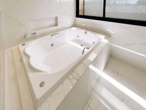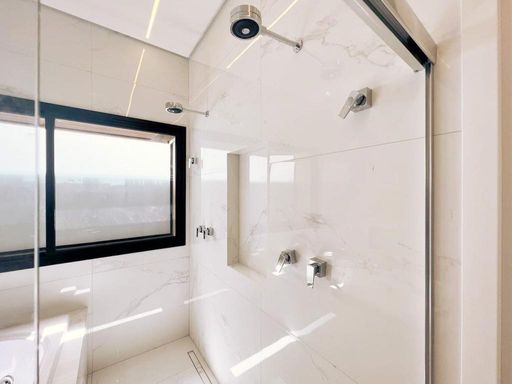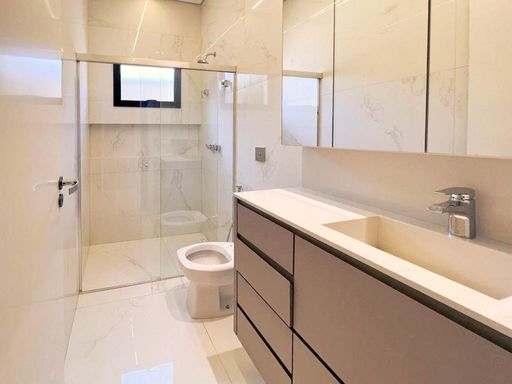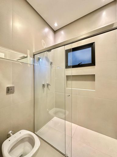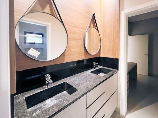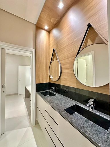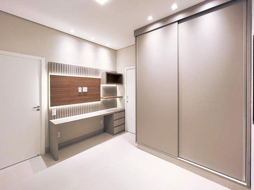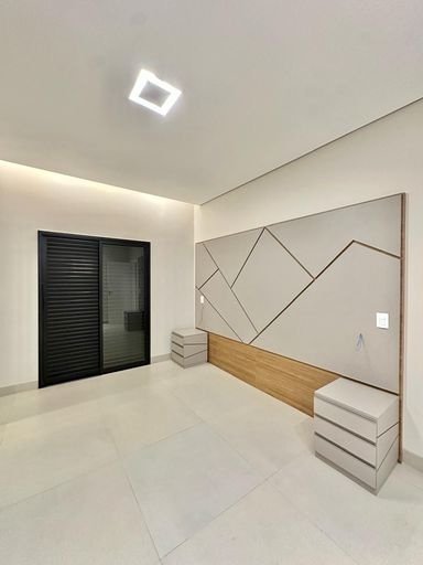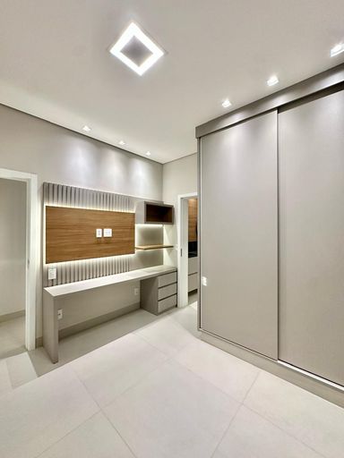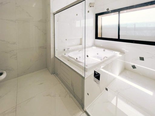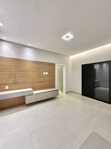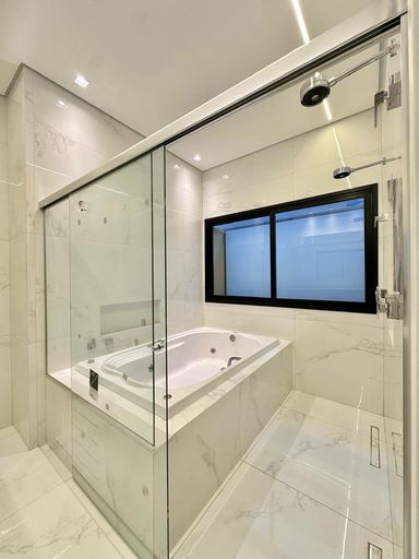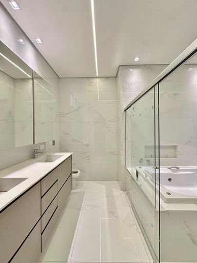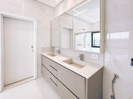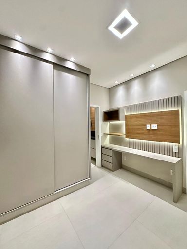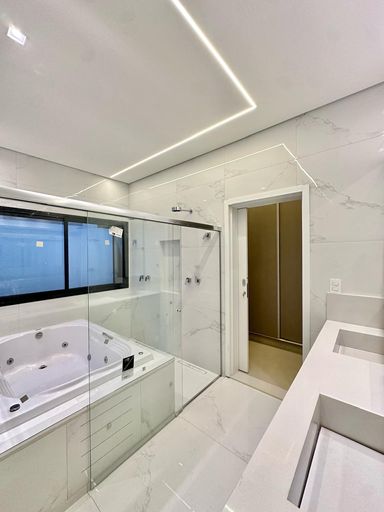 - 1 suíte master com closet + painel de TV + cabeceira estilizada + banheiro com pias e chuveiros duplos e banheira (com floreira)