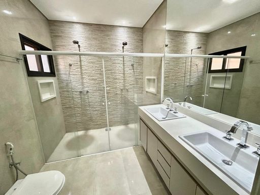 - cubas e chuveiros duplos no banheiro da suíte