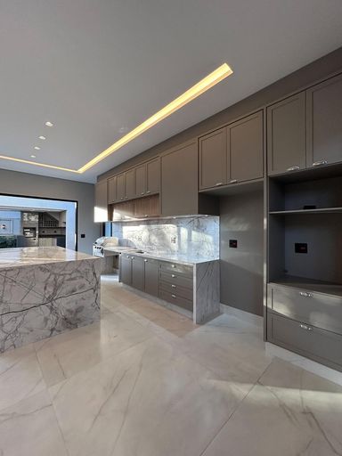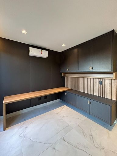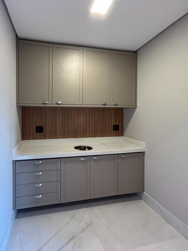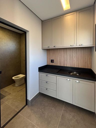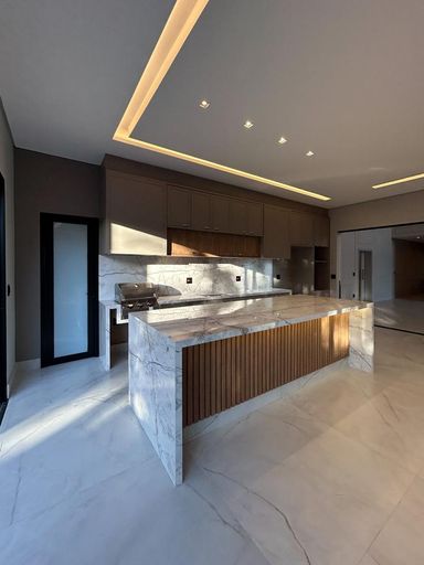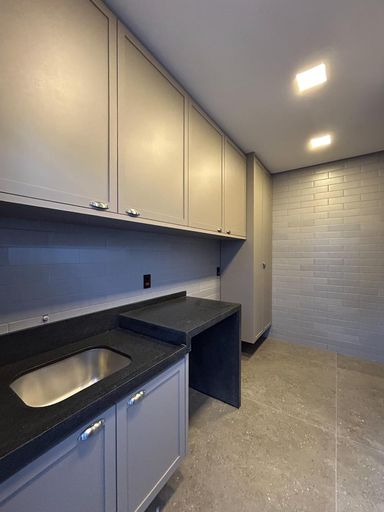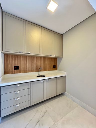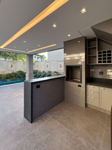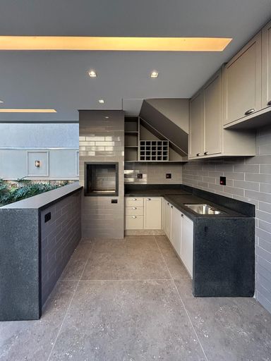 Cozinha com área gourmet, churrasqueira e balcão