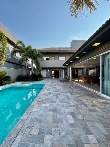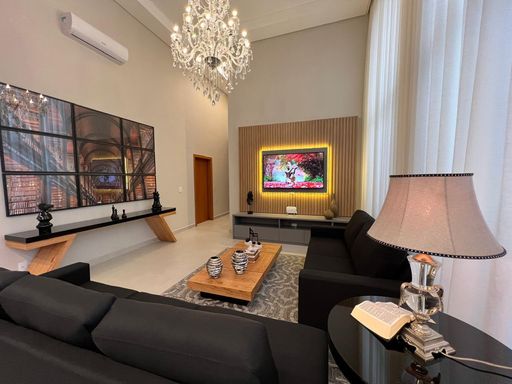 Sobrado com elevador à venda, todo mobiliado, com 451,21 m² de excelente padrão construtivo, distribuídos em 4 quartos suítes (1 master), escritório, sala ampla, cozinha interna e uma área gourmet aconchegante, bem equipada com churrasqueira, projetor, balcão refrigerado, adega e torre quente, integrada com espaço de quintal e piscina, aquecida e com bar molhado. Em excelente localização, na Fase 1 do Golden Park, essa excelente casa fica próxima a entrada do Condomínio, e oferece também: 4 suítes (1 master com closet) no piso superior Elevador e escada Casa Mobiliada Cozinha Interna Área Gourmet próximo ao corpo da casa Piscina aquecida com bar molhado Escritório Sala de TV Lavabo Lavanderia 2 Vagas de garagem, sendo 2 cobertas *Casa toda climatizada, tomada para carro elétrico, balcão refrigerado, adega climatizada, mobília inclusa, projetor. Observações: Consulte-nos sobre a disponibilidade e as informações do imóvel anunciado. Valores sujeitos a alteração.
