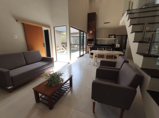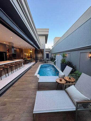Casa térrea à venda, com 262 m² de construção, distribuídos em 3 quartos suítes, escritório, sala ampla com pé direito duplo e uma área gourmet aconchegante, bem equipada e integrada com o espaço da piscina. Em excelente localização no Condomínio, a casa é toda climatizada e oferece também: 3 suítes todas com closet e 1 com hidromassagem Riolax Porta balcão com veneziana automatizada em todos os quartos Escritório Lavabo Home mobiliado e com sofá Living mobiliado Piscina aquecida com cascata e hidro Área externa com mesa e cadeiras de sol Fibratto novas e toldo automatizado Energia fotovoltaica Casa 100% climatizada Cozinha gourmet com: churrasqueira a gás e churrasqueira a carvão chopeira / cervejeira / máquina de lavar louça / micro-ondas / forno elétrico / cooktop de indução / coifa / caixas de som JBL embutida no teto, toda mobiliada com banquetas e mesa de 8 cadeiras. 2 Vagas de garagem, sendo 2 cobertas Observações: Consulte-nos sobre a disponibilidade e as informações do imóvel anunciado. Valores sujeitos a alteração.