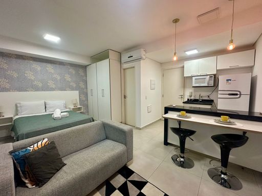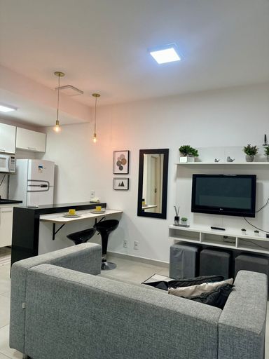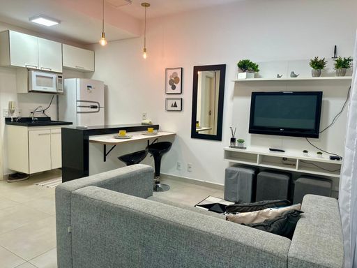 Apartamento à venda, mobiliada, totalmente funcional, com 33 m² de ambientes integrados, sendo 1 quarto, sala, cozinha e banheiro.