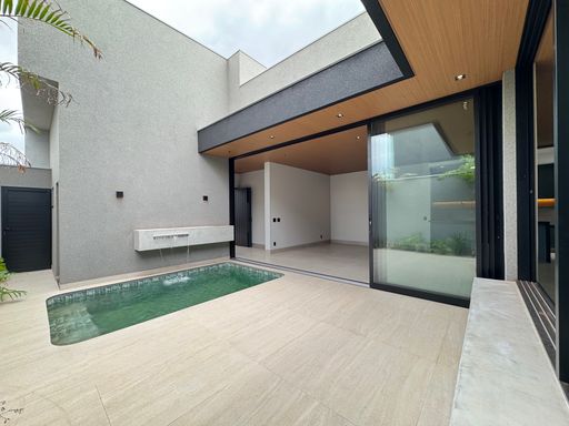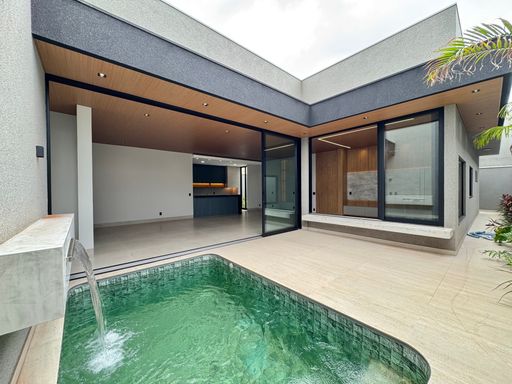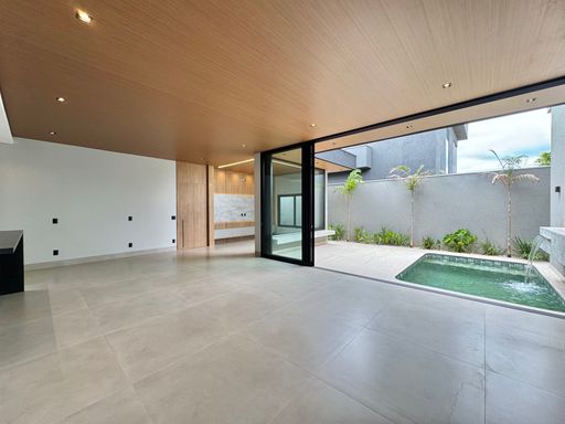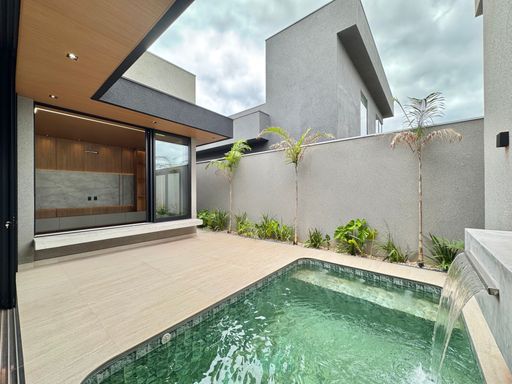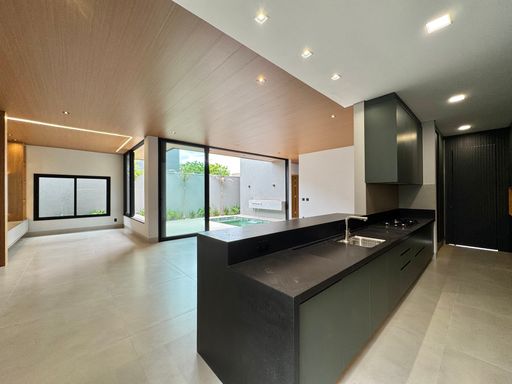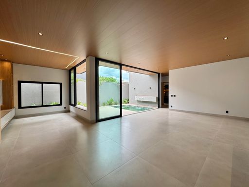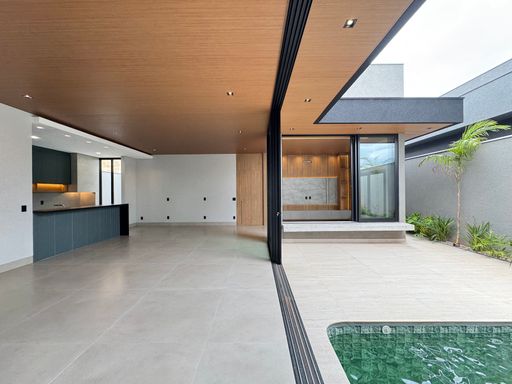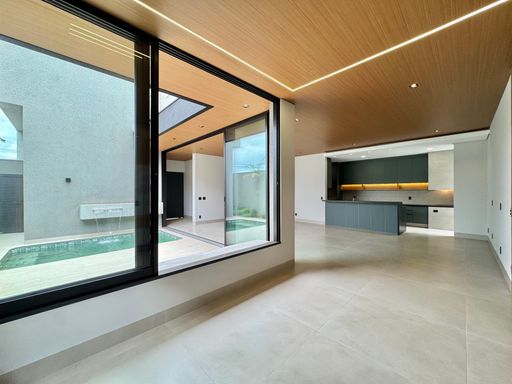 Casa térrea à venda totalmente funcional, com 230 m² de construção, distribuídos em 3 quartos suítes, escritório, living com pé direito alto e área gourmet integrada com área da piscina.