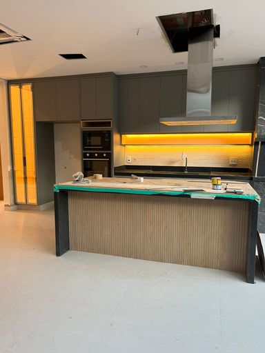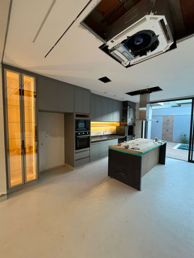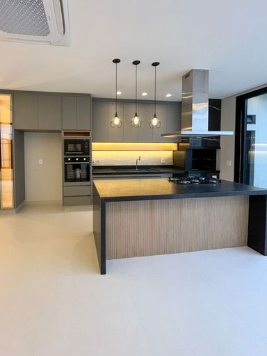 Área gourmet com cooktop, forno, microondas e ar condicionado cassete