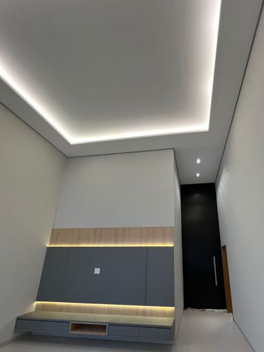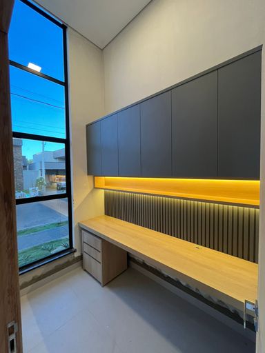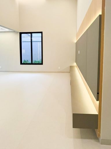 Sala com pé direito alto completa de armários