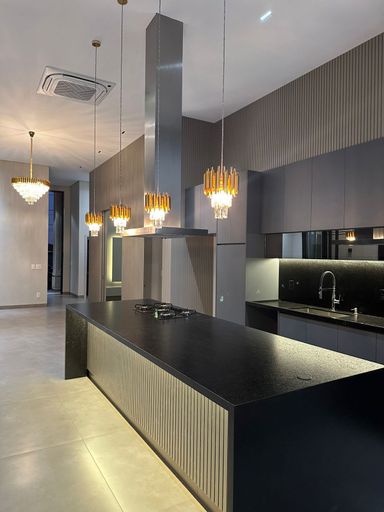 Espaço gourmet equipado com cooktop 5 bocas, coifa de ilha, cervejeira e adega climatizada