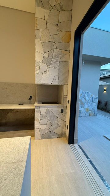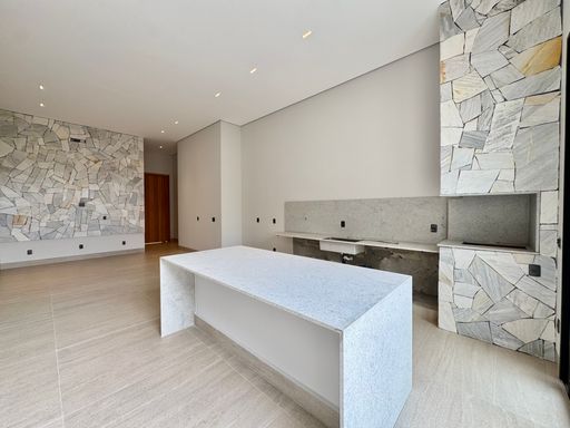 Cozinha com área gourmet, churrasqueira e balcão