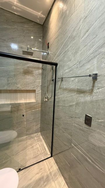 Banheiro externo completo com chuveiro e box