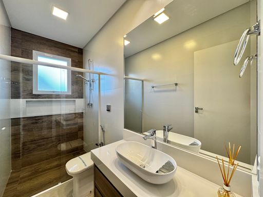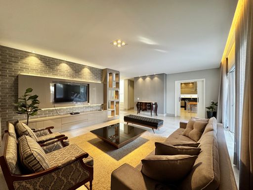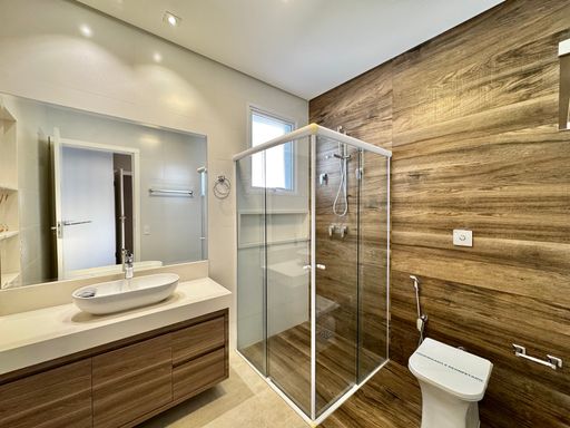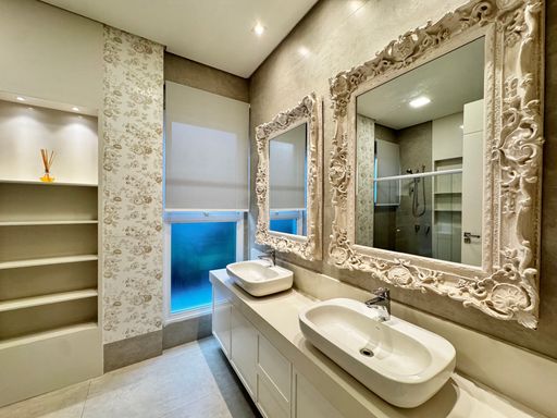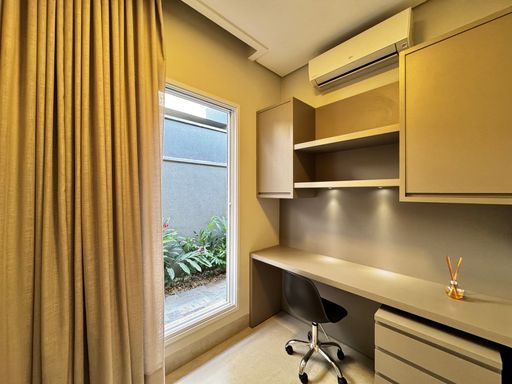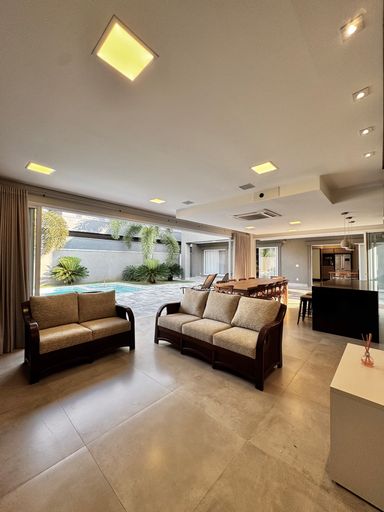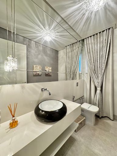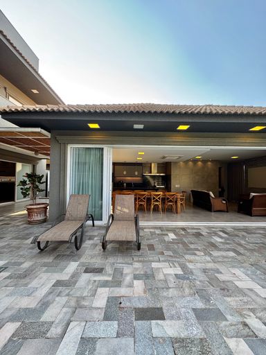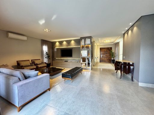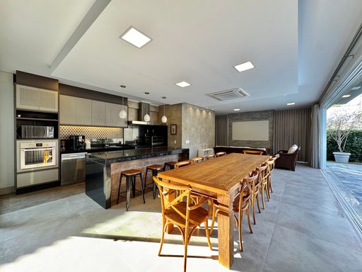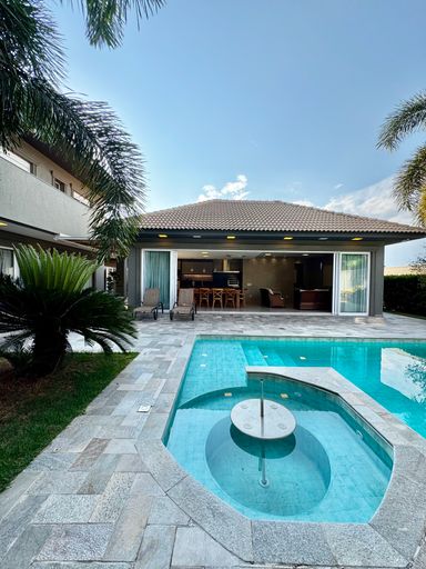 Sobrado com elevador à venda, todo mobiliado, com 451,21 m² de excelente padrão construtivo, distribuídos em 4 quartos suítes (1 master), escritório, sala ampla, cozinha interna e uma área gourmet aconchegante, bem equipada com churrasqueira, projetor, balcão refrigerado, adega e torre quente, integrada com espaço de quintal e piscina, aquecida e com bar molhado.